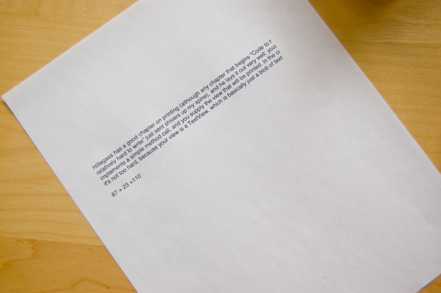So that’s just derailed my day. Because as I set out on this post, I was looking to just put the printing thing behind me and get to something else I’ve been working on. But no, that’s not how we roll here. I’m going to return to Hillegass, and I’m going to create that view, and I’m not only going to make printing work, I’m going to make it work right, and it’s going to be awesome.
